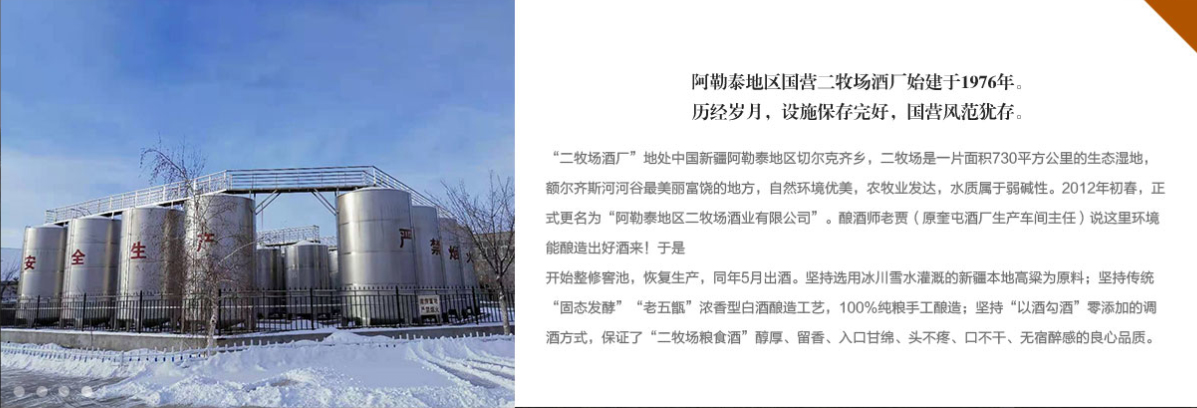 二牧场粮食酒用“水”水乃酒之血,古有“美酒佳泉”之说。二牧场粮食酒酿造用水,全部取自新疆阿勒泰山冰川雪水。水纯低纳,富含硅、锶等多种有益于人体健康的矿物质和微量元素,水质清冽晶莹,成酒香浓甘润。 ——